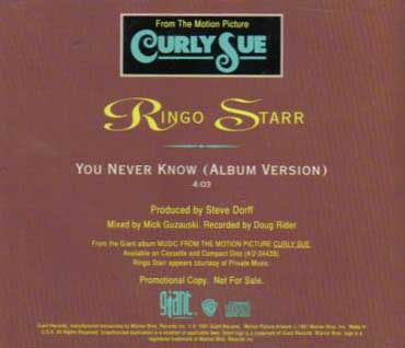 This rare oddity recorded by Ringo Starr, "You Never Know", was a song originally included on the motion picture soundtrack Curly Sue. Written by John Bettis and Steve Dorff, Ringo sang this pleasant pop piece while signed as a recording artist with Private Music.
